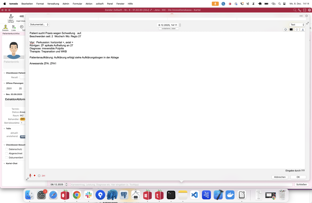 Dank künstlicher Intelligenz gelingt Ihre Dokumentation mit tomedo.Dental noch schneller. Nutzen Sie während Ihres Patientengesprächs einfach unseren Sprechstunden-Assistenten. Das Gespräch wird für Sie aufgezeichnet, anhand Ihrer eigenen Kriterien strukturiert und in der entsprechenden Kartei abgespeichert. Sie suchen eine bestimmte Information in einer umfangreichen Patientenkartei? Kein Problem mit dem intelligenten Karteichat: Einfach fragen, einfach finden.