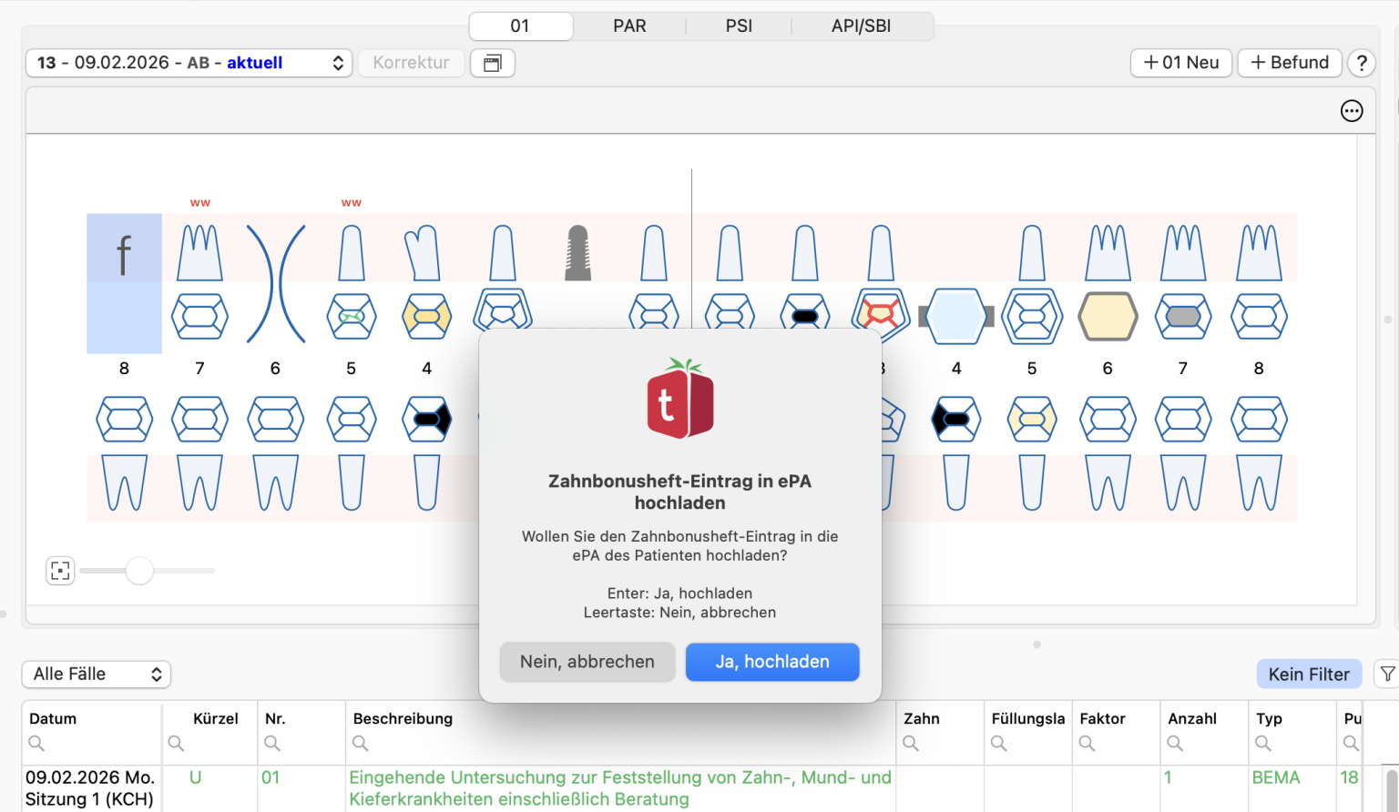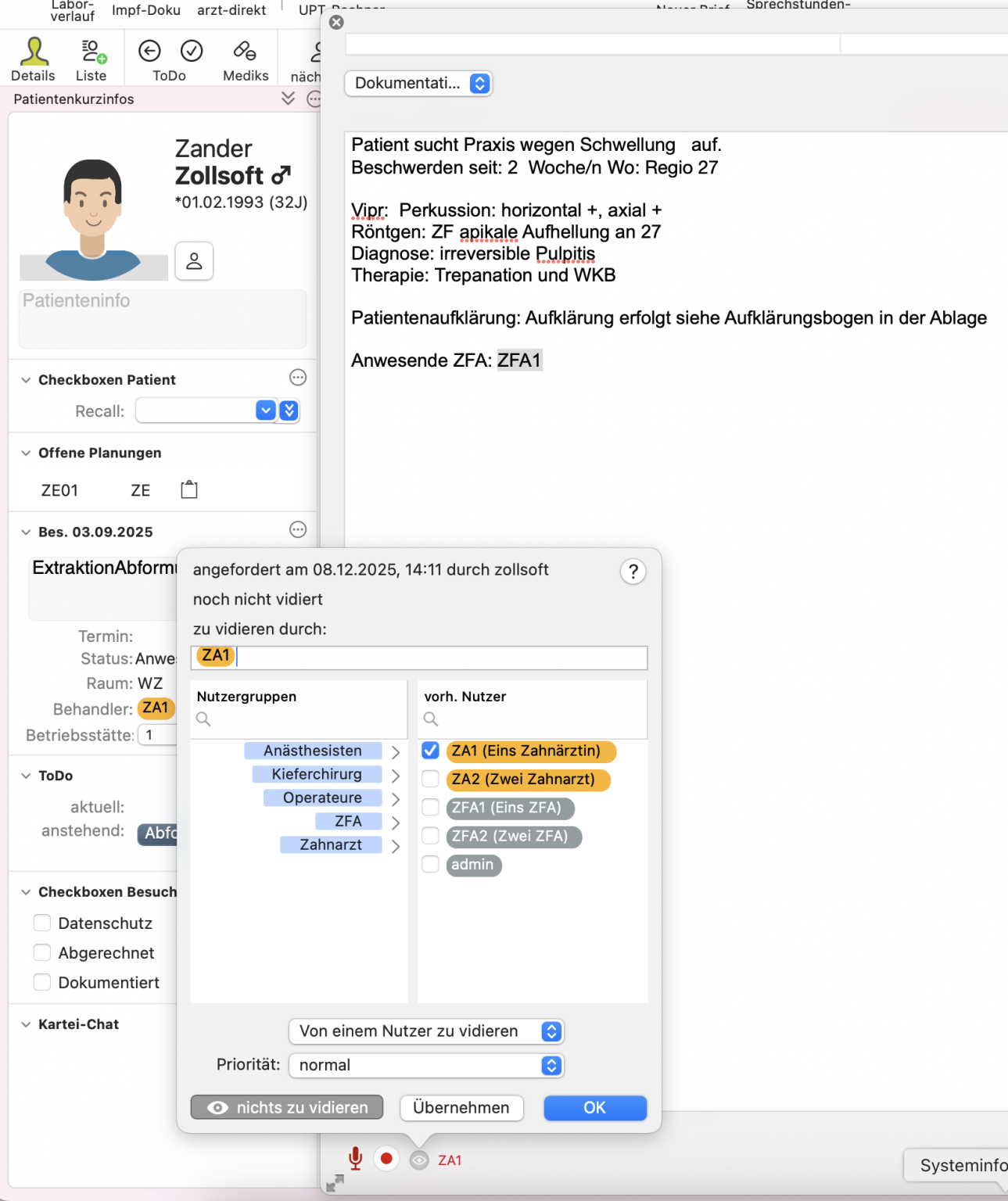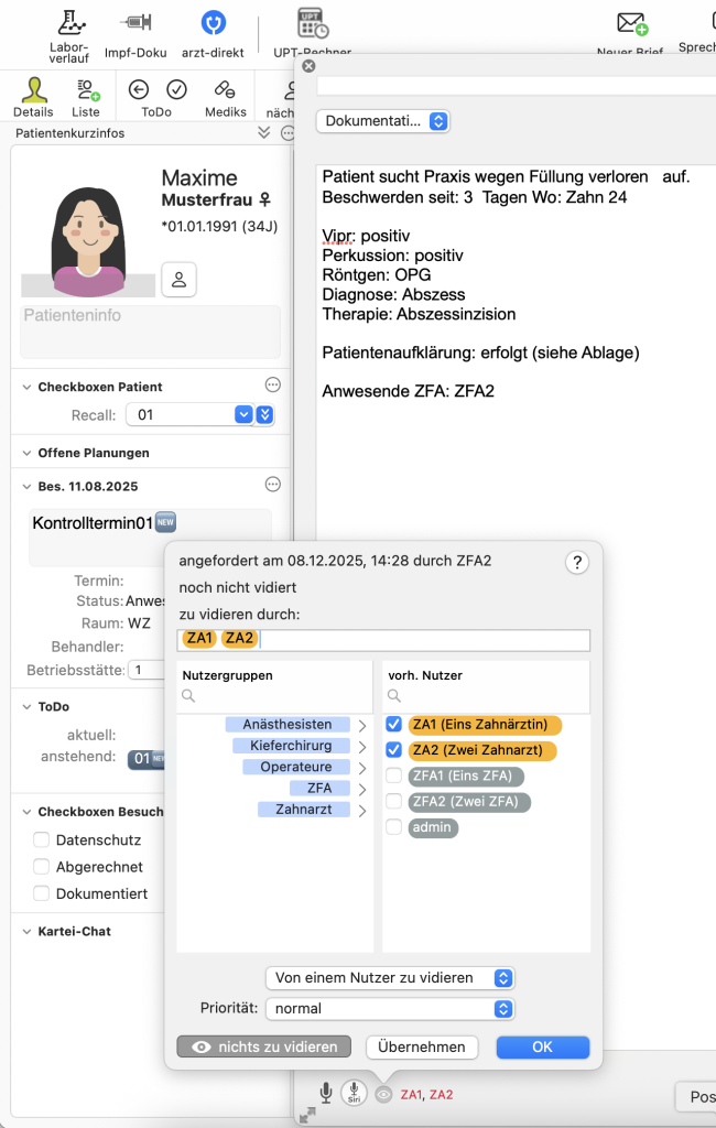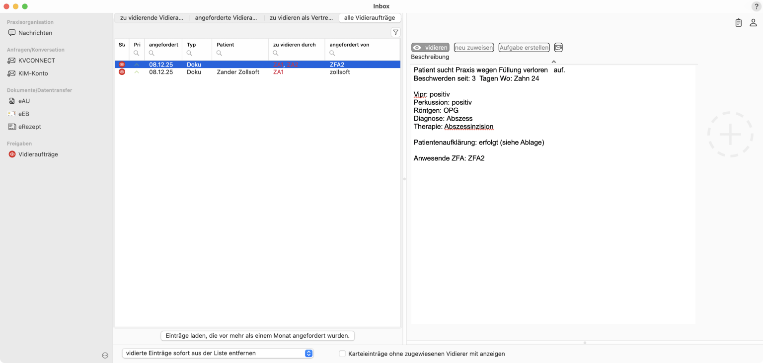 Kein Papierstapel mehr auf Ihrem Schreibtisch: Muss ein Karteieintrag zwingend durch Sie gesichtet und bestätigt werden? Mit tomedo.Dental ist die Vidierung von Karteieinträgen denkbar einfach: Sämtliche Dokumente, Notizen oder Anhänge können mit Vidieraufträgen versehen werden. Offene Aufträge sind jederzeit einsehbar, sowohl direkt in der Patientenakte als auch gesammelt in der tomedo.Dental-Inbox.