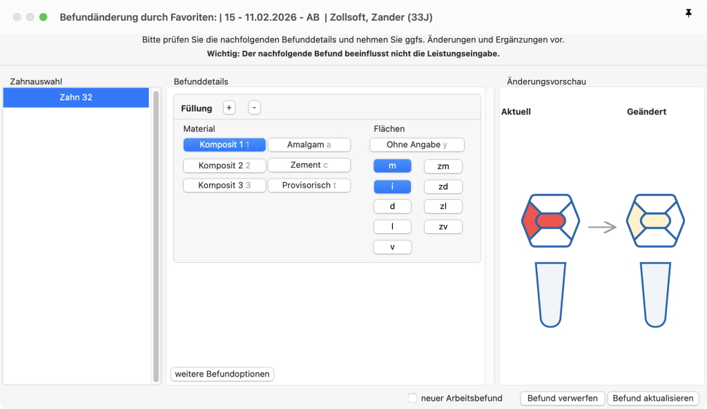 tomedo.Dental passt sich Ihren Praxis-Abläufen an: Ein Beispiel dafür ist das Favoritenkonzept, das Routineaufgaben spürbar vereinfacht. Für einen schnellen Start bei typischen Behandlungsabläufen liefert tomedo.Dental bereits vorkonfigurierte Favoriten-Sets aus. Für Spezialbehandlungen in Ihrer Praxis können Sie eigene Favoriten konfigurieren. Diese Favoriten sind mit einem Klick in der Patientenakte verfügbar.